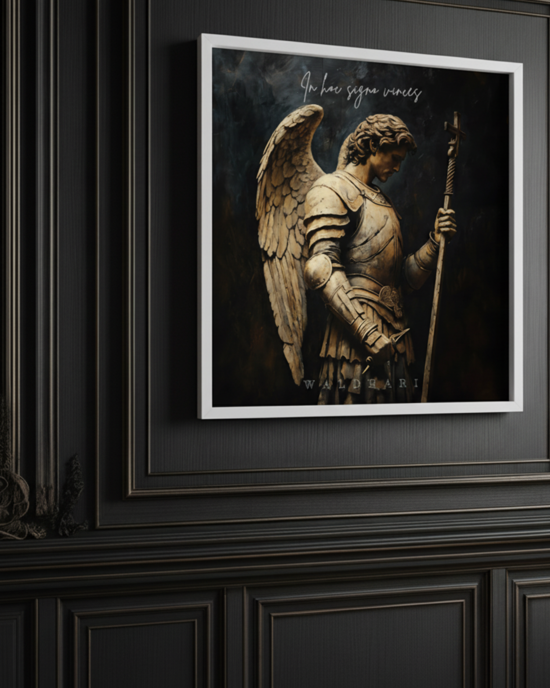 Redécouvrez la force et la majesté de l'archange Saint Michel avec ce magnifique tableau "In hoc signe vinces" ou "par ce signe tu vaincras". Conçu pour capturer l'intensité et la noblesse de cette figure céleste ainsi que la puissance de la croix, ce tableau apportera une touche de spiritualité et de grandeur à votre intérieur.